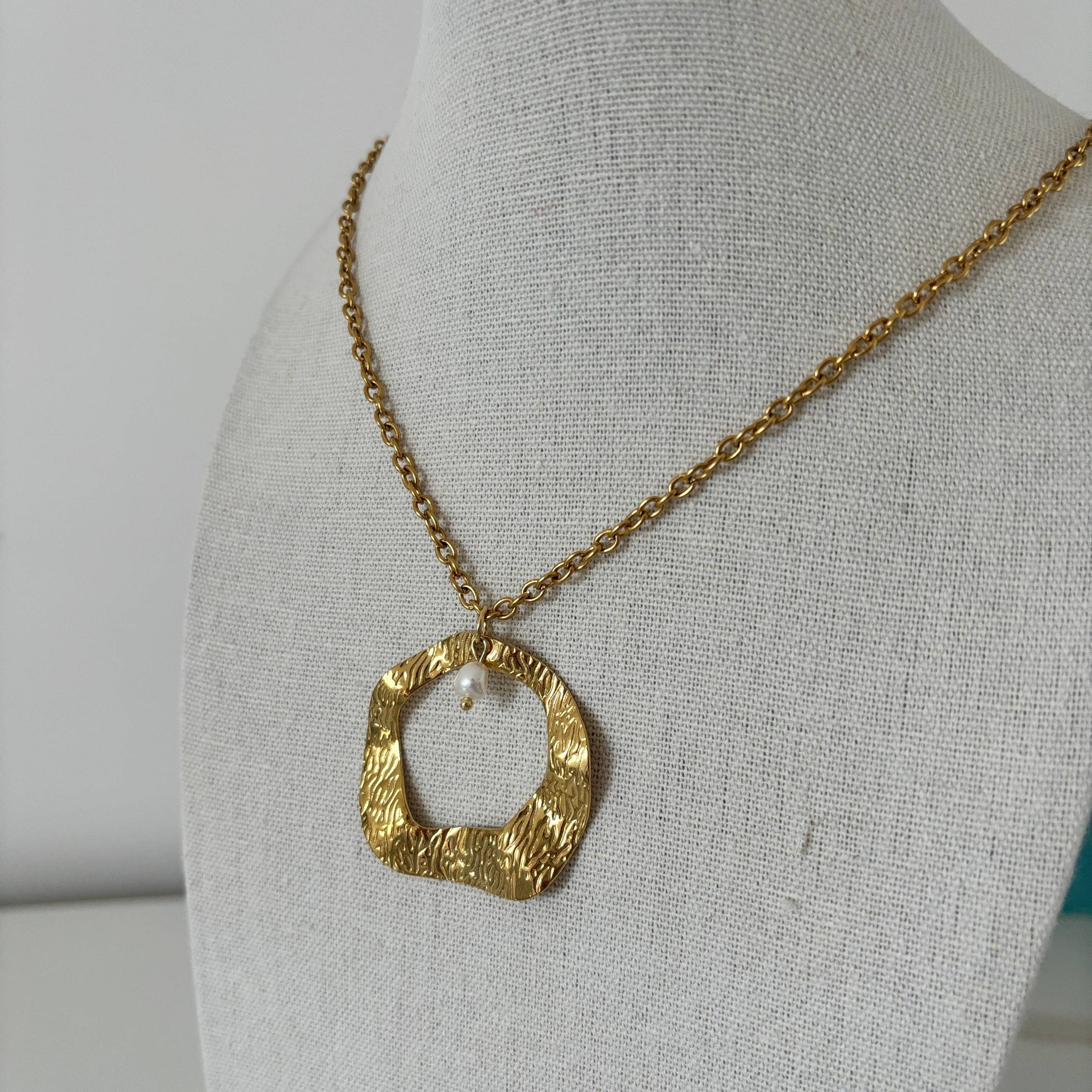 Ontdek tijdloze elegantie met onze K18 vergulde roestvrijstalen halsketting, voorzien van een unieke zwevende ronde hanger met een gefacetteerde rivierparel aan de binnenkant. Dit prachtige stuk combineert de klassieke allure van parels met de stralende glans van goud, waardoor het een perfect accessoire is voor zomerse outfits, vooral die met opvallende halslijnen.