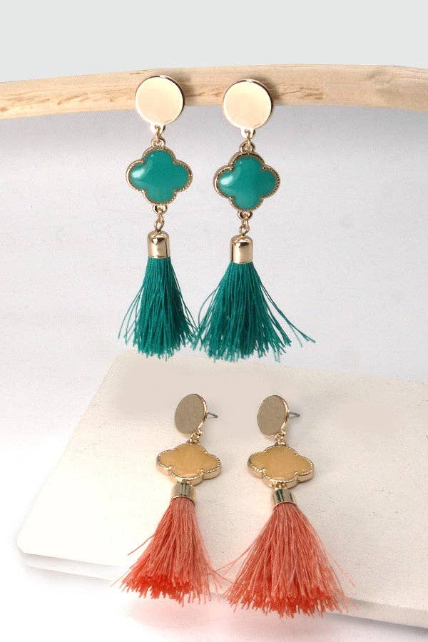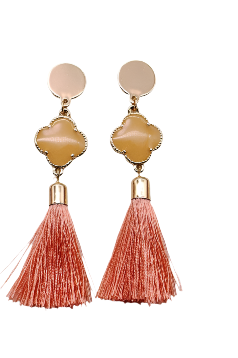 De lineaire druppelklaver van Rafia met kwastjes en gouden oorknopjes is voorzien van epoxyklaver en lineaire kwastjes, perfect voor elke boho-glam-look!