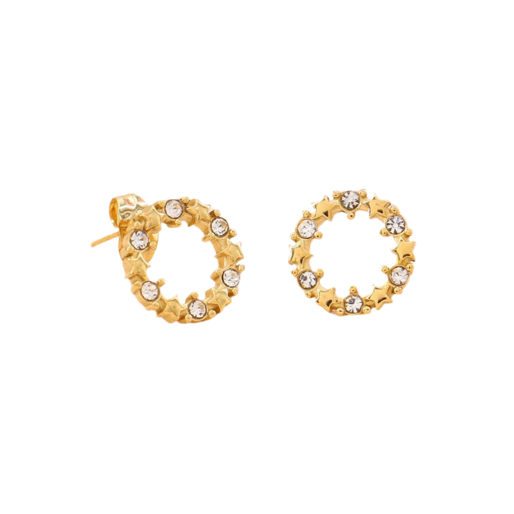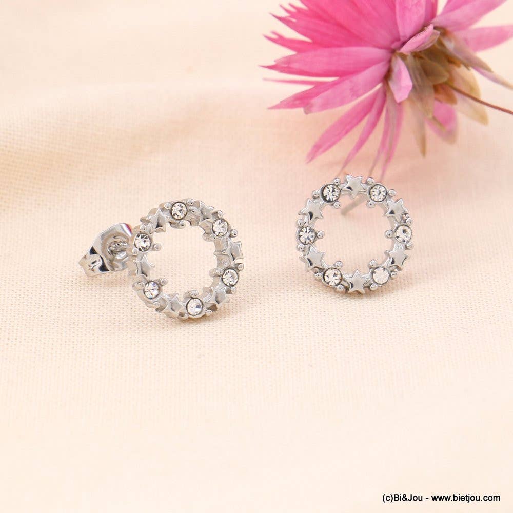 Ronde oorknopjes van roestvrij staal met hart- en strassring voor dames 0323126. Deze stalen oorknopjes worden bevestigd met een vlindersluiting en siliconen tip. Beschikbare kleuren zijn goud en zilver. Hun diameter is 12 mm. Deze mooie oorbellen bevatten geen nikkel, lood of cadmium en zijn antiallergisch (in overeenstemming met de Franse en Europese wetgeving).