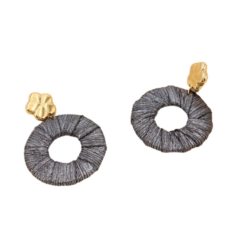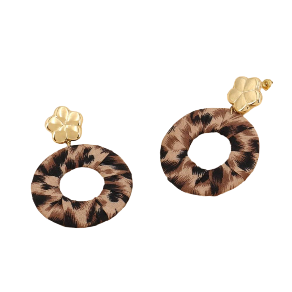 Oversized oorbellen, ambachtelijke stijl, grote ronde ringen en bloem cabochons van roestvrij staal voor dames 0324605. Deze oorbellen hebben een circulair ontwerp van luipaardprint stof of glanzende metalen draden, met een geplooid en getextureerd uiterlijk dat een vleugje moderniteit en elegantie toevoegt. Dit model is zowel chic als eigentijds, perfect om een vleugje originaliteit en verfijning aan een outfit toe te voegen. De afmetingen zijn 50x72mm. Deze oorbellen worden aan het oor bevestigd met een steker en een vlindersluiting van verguld roestvrij staal. Nikkelvrij, loodvrij, cadmiumvrij.